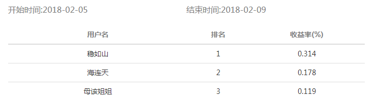 海知理財(cái)·2018-2-1 期比賽結(jié)果公布如下:
