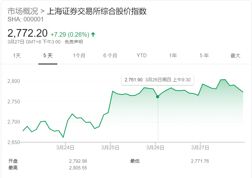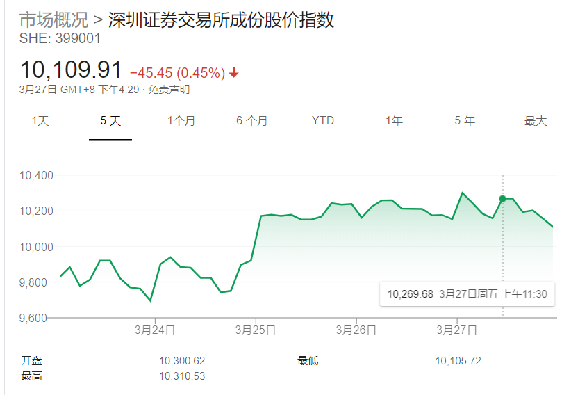 得益于國內(nèi)疫情得到控制,各地陸續(xù)復工,本周大盤整體呈現(xiàn)上升趨勢,截止2020-03-27當天收盤,上證指數(shù)回升到2772.2,深證指數(shù)也回升至10109.91