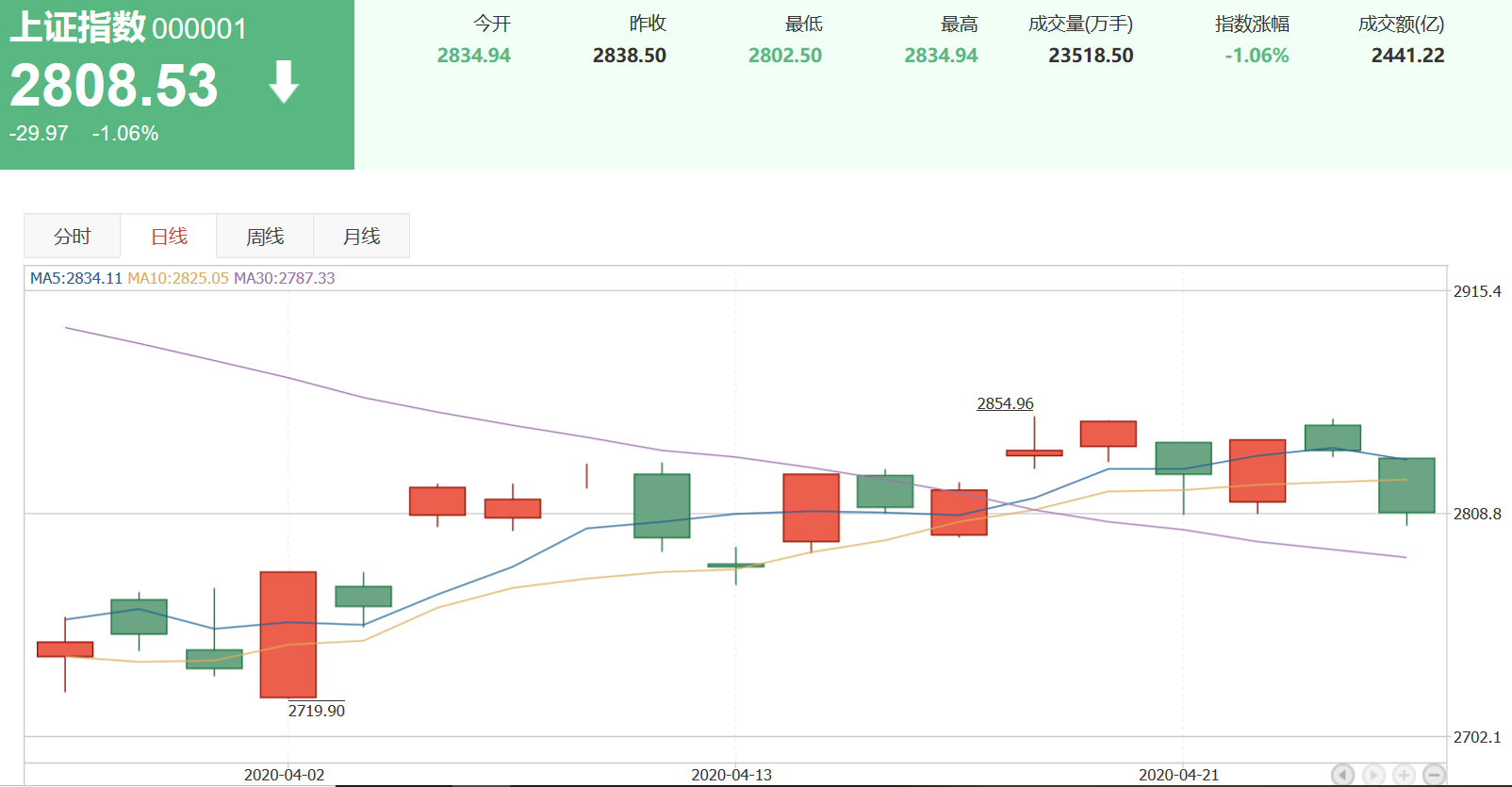 1. 現(xiàn)狀分析:上證指數(shù)在最近一周以來,漲幅-1.05%,收盤2808.53;