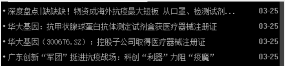 本周國(guó)際疫情愈發(fā)嚴(yán)峻,醫(yī)療器械迫切需要,醫(yī)療股普遍受青睞,在3月25日華大基因曝出資源供不應(yīng)求(試劑盒是重點(diǎn))的新聞后第二天以10.01%的漲幅漲停,新聞如下: