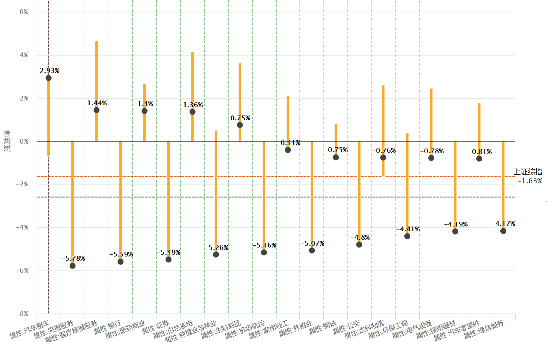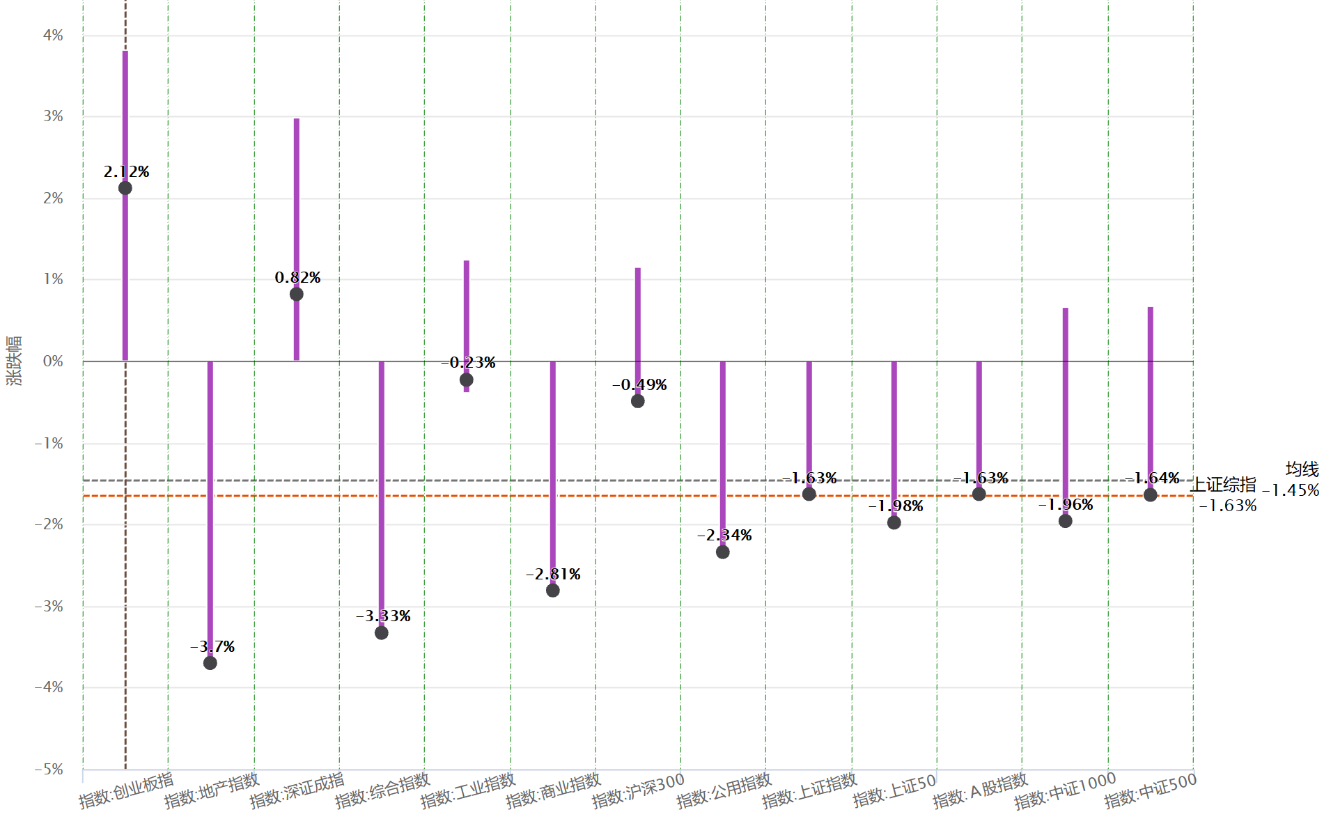 10.26-10.30這一周整體指數(shù)走勢逐漸走弱,其中上證指數(shù)漲跌幅為-1.63%, 滬深300為-0.49%。指數(shù)大度為負(fù)值增長,而創(chuàng)業(yè)板整體表現(xiàn)較好,其次為深證指數(shù),但是深證指數(shù)也僅為微弱增長,為0.82%。