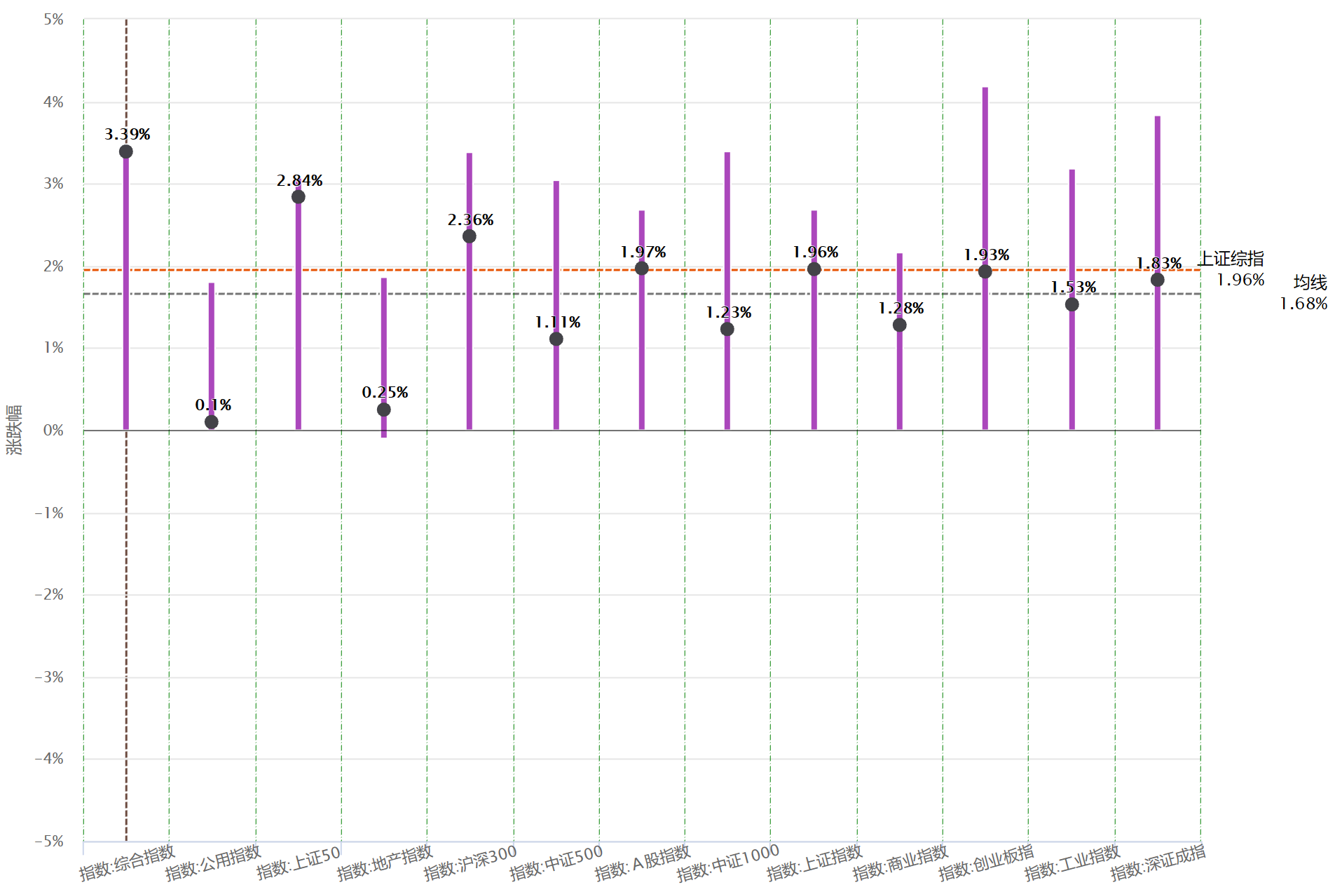 10.12-10.16這一周大盤走勢回轉(zhuǎn)且整體走勢較優(yōu),從指數(shù)漲跌幅中可以看出,平均漲幅為1.68%,其中深證指數(shù)漲幅為1.83%,上證漲幅為1.96%,均高于平均值。